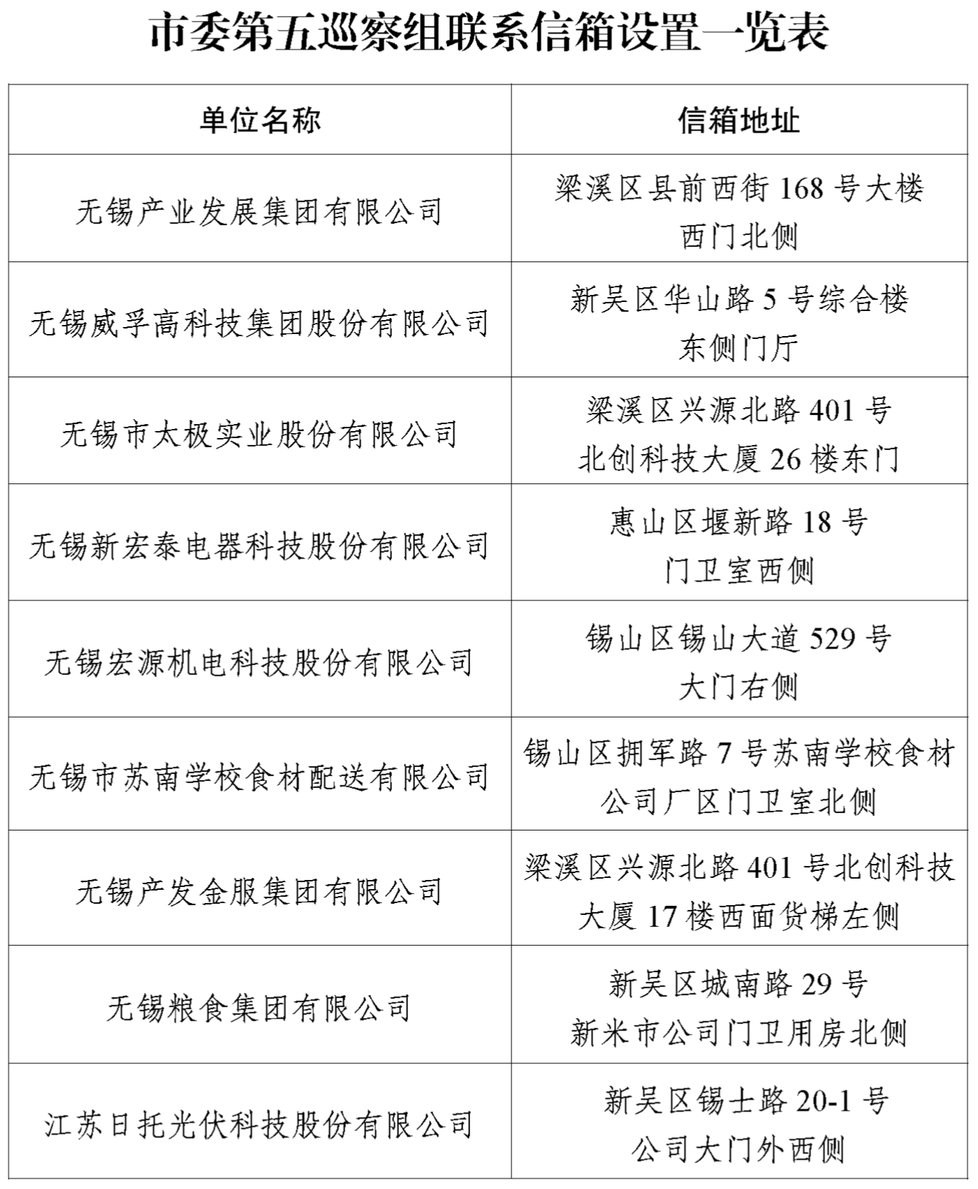 接洽信箱:无锡财产成长团体无限公司及局部全资、控股企业接洽信箱设置地点详见“市委第五梭巡组接洽信箱设置一览表”。